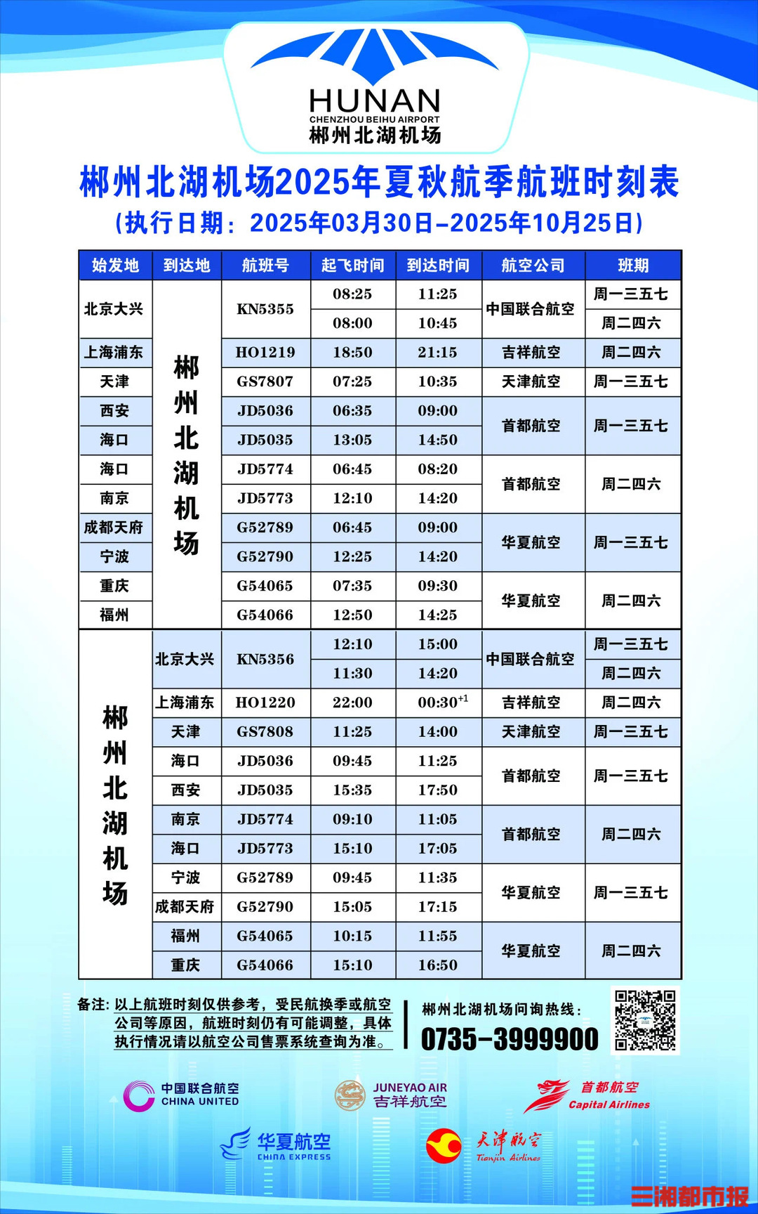 郴州北湖机场调整航季,直飞十城 作者:小娟 • 更新时间:2025-03-17 21:18 •来源:华声在线 3月17日,记者获悉,郴州北湖机场3月30日至10月25日执行全国民航夏秋航季航班计划,共计210天。计划与中国联合航空、吉祥航空、首都航空、华夏航空、天津航空5家航空公司合作,共同经营7条往返航线,通达国内北京大兴、上海浦东、成都天府、天津、西安、海口、南京、重庆、福州、宁波10个航点。 本文采摘于网络,不代表本站立场,转载联系作者并注明出处:/waq/2925.html