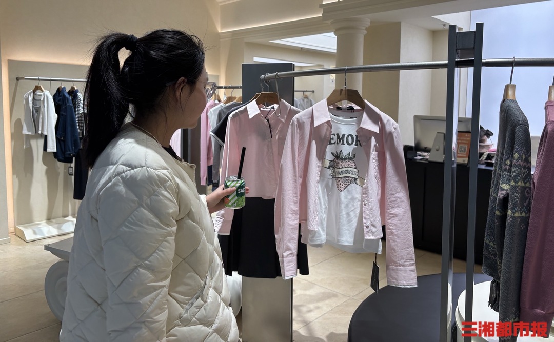 3月17日,记者来到长沙WM(国金街)店铺,一进门,刚上新不久的春夏服饰映入眼帘,从春季的针织开衫和衬衫再到夏日吊带和短裙,面料整体偏轻薄和通透,春日气息扑面而来,不少顾客正在挑选和排队试衣。“我选了5件,清新甜美就是我的风格。”00后小张分享。