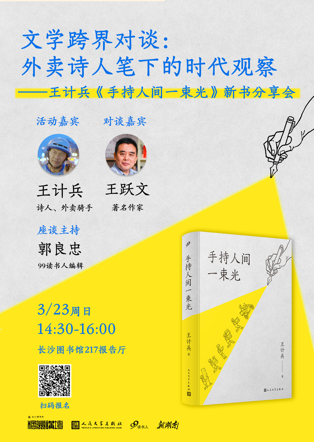 3月23日,“文学跨界对谈:外卖诗人笔下的时代观察——王计兵《手持人间一束光》”新书分享会在长沙市图书馆举行,外卖骑手、诗人王计兵将与湖南作家王跃文展开诗意对话,讲述平凡生活里的温暖与感动。