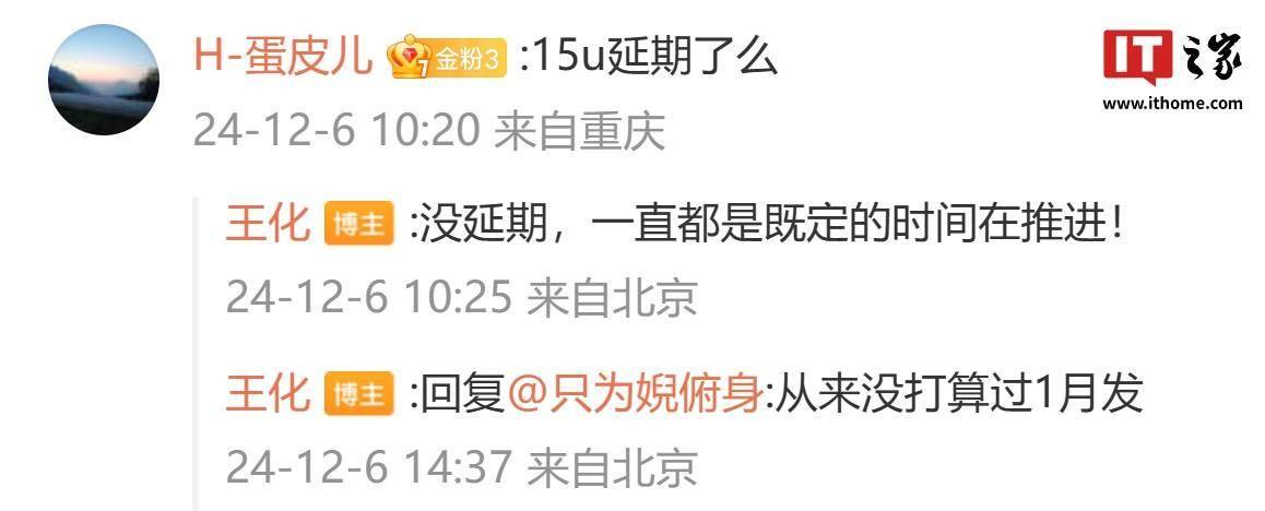他在评论区回复网友“15u 延期了么”的问题时表示:“没延期,一直都是既定的时间在推进!”“从来没打算过 1 月发”。