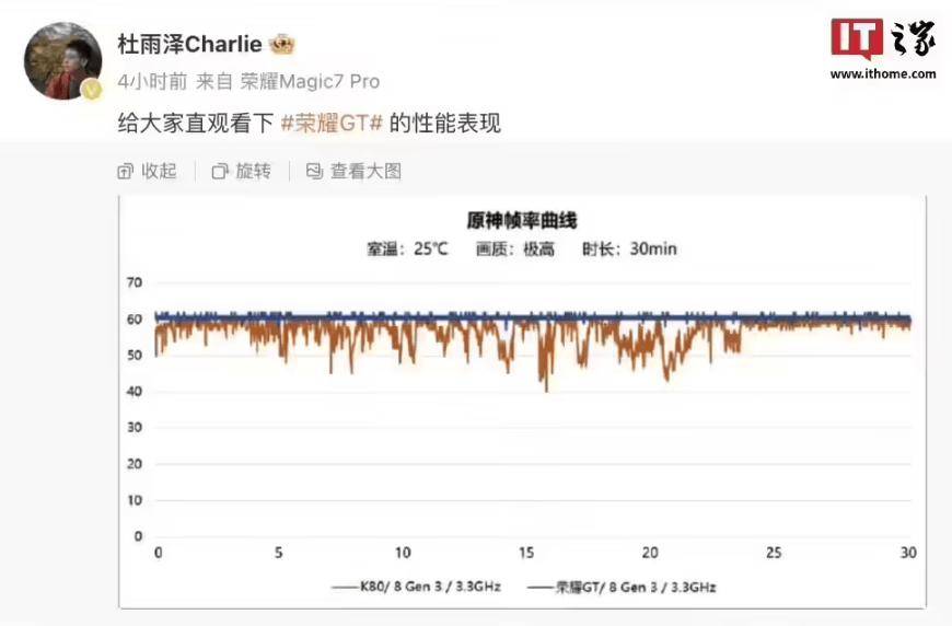 值得一提的是,不久前荣耀 GT 系列产品经理 @杜雨泽Charlie 分享了新机帧率图。面对极高画质的《原神》,荣耀 GT 30 分钟的测试帧率曲线基本就是一条直线,可见其在性能和游戏体验优化上确实是下了功夫的。