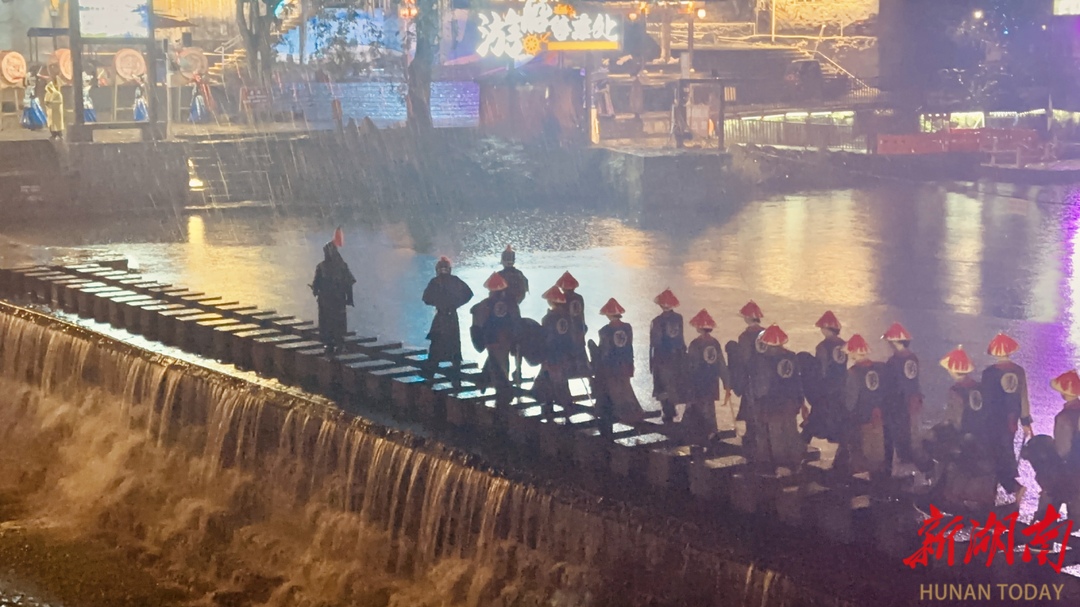 夜幕降临,万溶江畔,乾州古城星光璀璨,宾客乘坐溶江画船,观《将士出征、送别、杀敌》情景演艺,以时空倒叙、3D光影等形式,采用水、火、光影等表现手段,震撼展示罗荣光率领三千将士抗击侵略者,身先士卒,誓死保卫大沽口炮台的战斗场景。