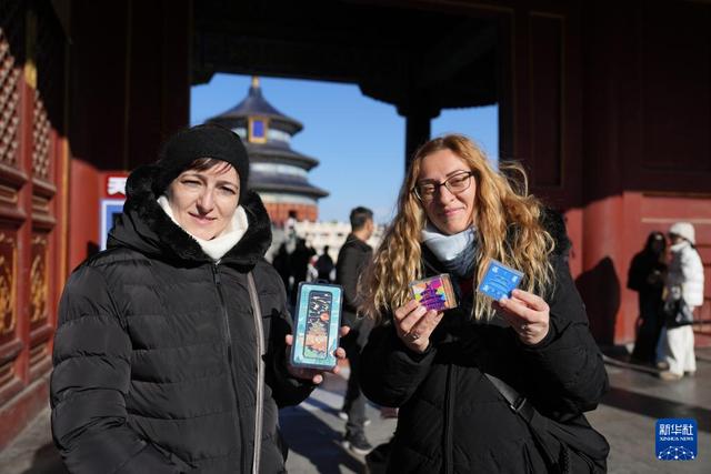 12月5日,两名来自匈牙利的游客展示她们购买的天坛公园纪念品。