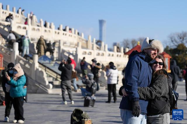 12月5日,两名来自英国的游客在北京天坛公园合影留念。