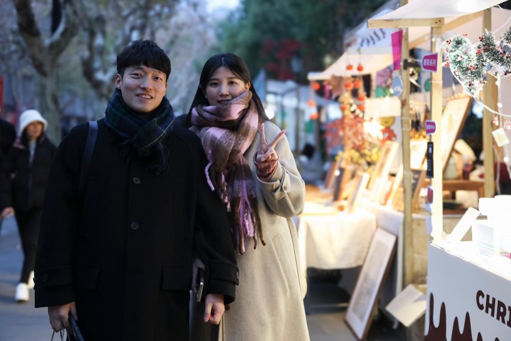 走进豫园商城,韩国游客在街边品尝特色美食;站在外滩观景台,他们与上海城市天际线合照的身影随处可见;穿行在新天地冬日市集的摊位间,“思密达”的声音在耳畔回荡……