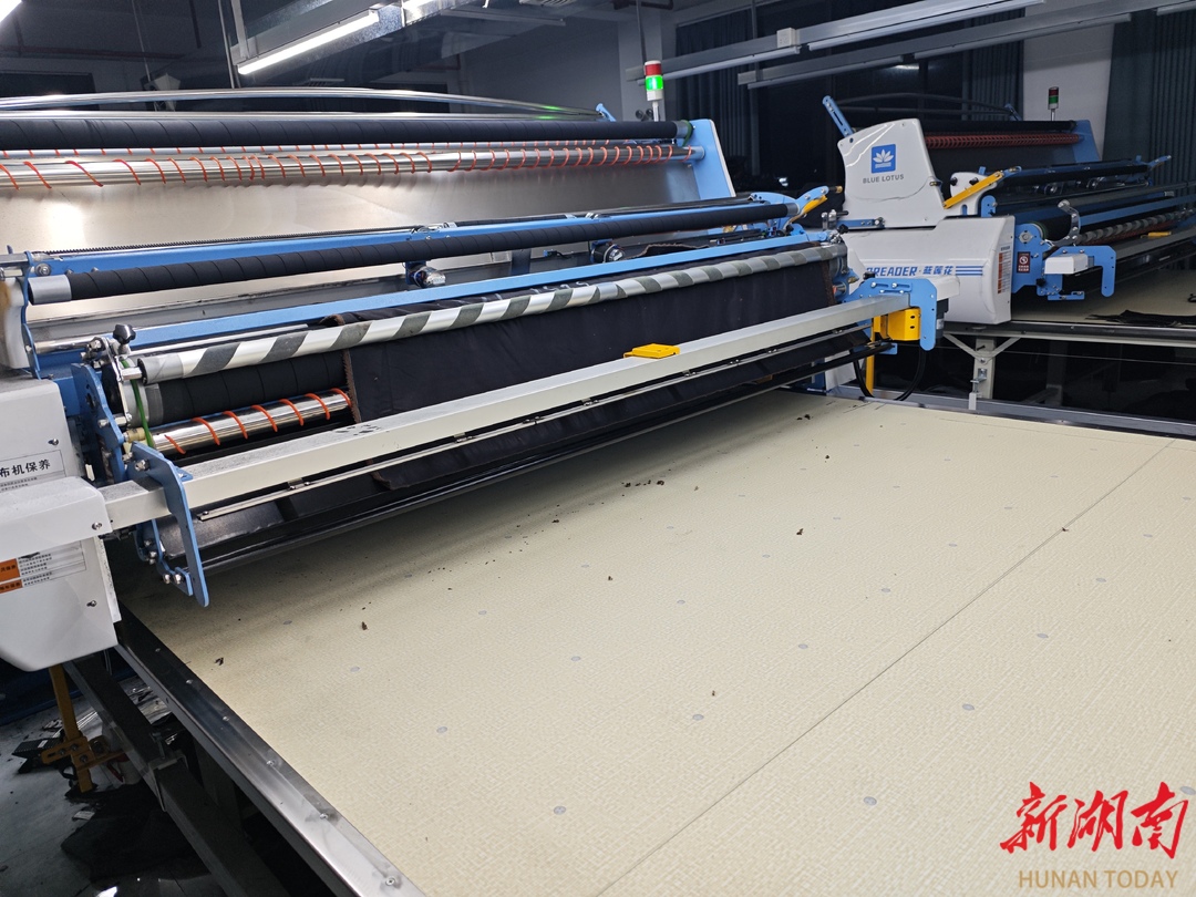 11月18日,湖南博琳妃服饰有限公司生产车间,装有”智衣通“系统的自动铺布机 张涛 摄