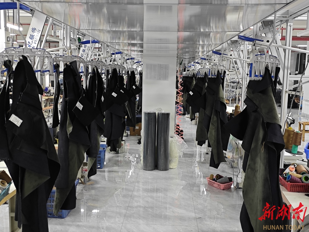 11月18日,湖南博琳妃服饰有限公司生产车间,装有”智衣通“和智能吊挂系统 张涛 摄