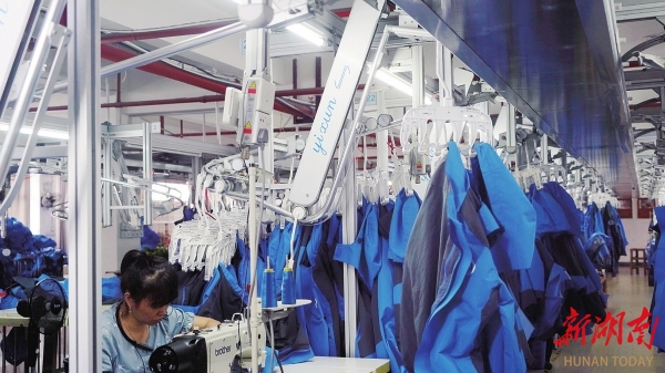 11月22日,配备智能吊挂系统和“智衣通”的湖南远赢服饰有限公司制衣车间。 通讯员 摄