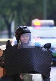 11月25日,长沙师范学院,摩托司机将保暖措施做到极致,抵御寒风。 图/记者肖天健