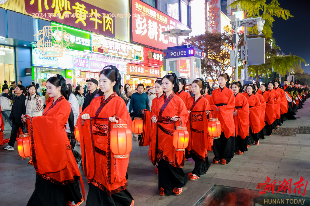 11月30日,夜色下的长沙市天心区黄兴南路步行街,华灯初上、端庄典雅。红毯、红妆,觥筹交错;囍字、乐舞,钟鼓齐鸣……一场古意盎然的“大汉婚典”在此上演。
