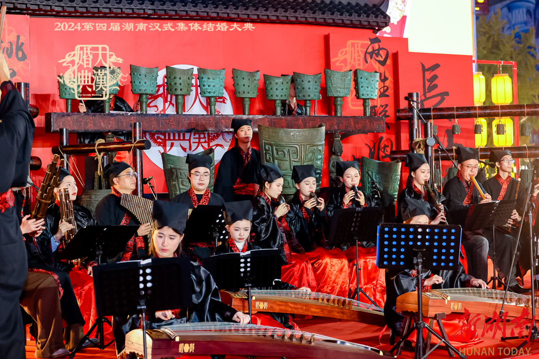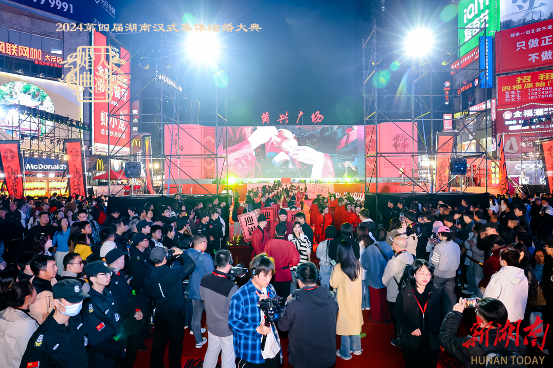 在喧天的鼓乐声中,新人们的表情喜悦而庄重,执手同行,从南门口巡游至司门口,再返回黄兴广场。柔和光线照耀着舞台,特别邀请的商代大铙古乐团奏响气势磅礴的钟鼓大乐,让喧嚣的黄兴广场变身庄重肃穆的古礼堂,每一位观礼的市民与游客都是见证。