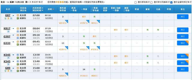 2025年1月13日北京至成都方向部分车次余票情况。来源:中国铁路12306官网,下同